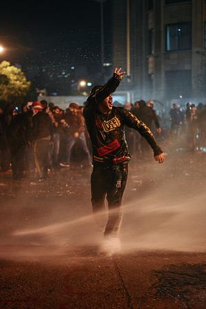 This photo depicts a protestor flipping off the operators of the water cannon positioned in front of the Lebanese parliament building.