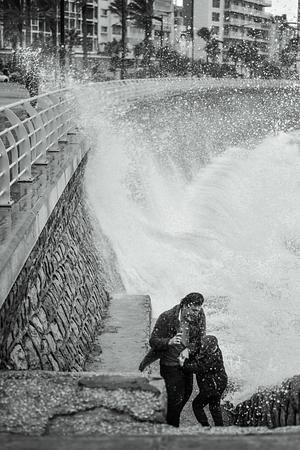 This photo was taken on Corniche el Manara right as the waves crashed against the shoreline. In the frame is a father and child who were actually standing close to where the wave crashed when I saw them. They ran up the stairs when I warned them.